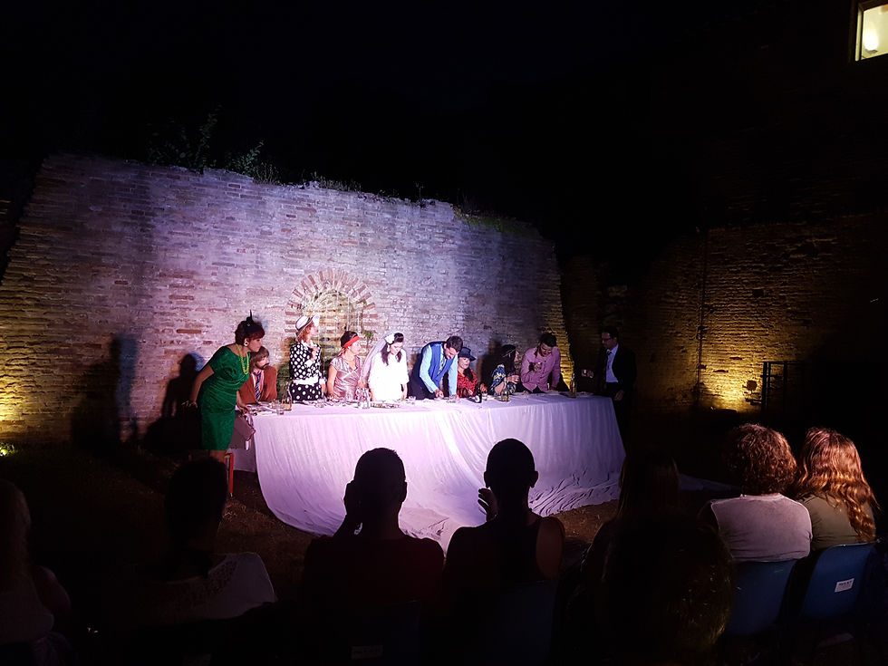 Un teatro che racconta, stupisce e diverte e che lo fa seguendo lo stile narrativo/teatrale di grandi autori ma imprimendo al contempo interpretazioni personali del regista Fabrizio Bartolucci che ha diretto i corsi di teatro del Laboratorio Linguaggi. Un crescendo d’accadimenti in cui protagonisti svelano al pubblico i lati più meschini e falsi della loro falsa convivialità e che riportano con feroce lucidità gli sposi alla prospettiva della loro imminente vita matrimoniale. Il torpore della festa svanisce e ai più non resta che un’amara quanto reale prospettiva. Uno spettacolo corale che vede in scena ben 30 attori del laboratorio guidati dal regista.